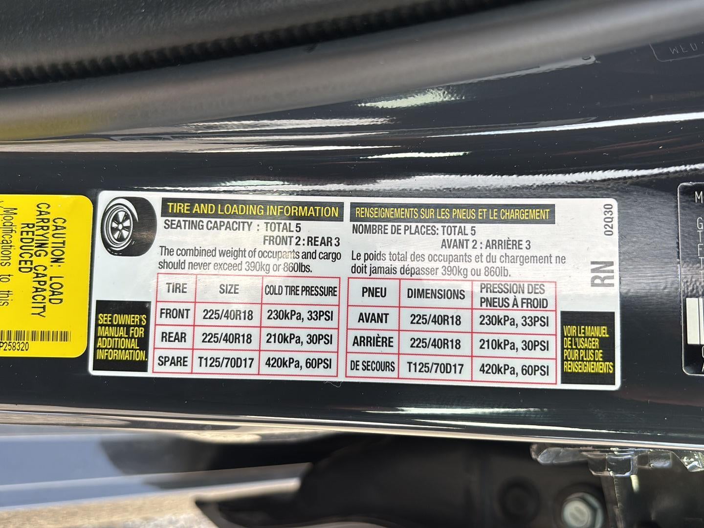 - Front Tire Size: P225/40VR18
