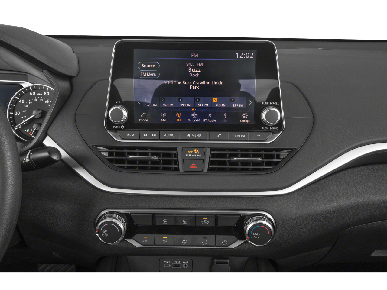 • Radio: AM/FM Audio System -inc: 6 speakers, aux input, NissanConnect featuring Apple CarPlay, Android Auto, 8" color touch-screen display, 1 front illuminated USB port (type-C) for compatible devices, SiriusXM radio w/advanced audio features, Bluetooth® hands-free phone system, streaming audio via Bluetooth®, hands-free text messaging assistant, 2 rear illuminated USB ports (type-A, 1 type-C) for compatible devices, Siri Eyes Free and Google Assistant voice recognition